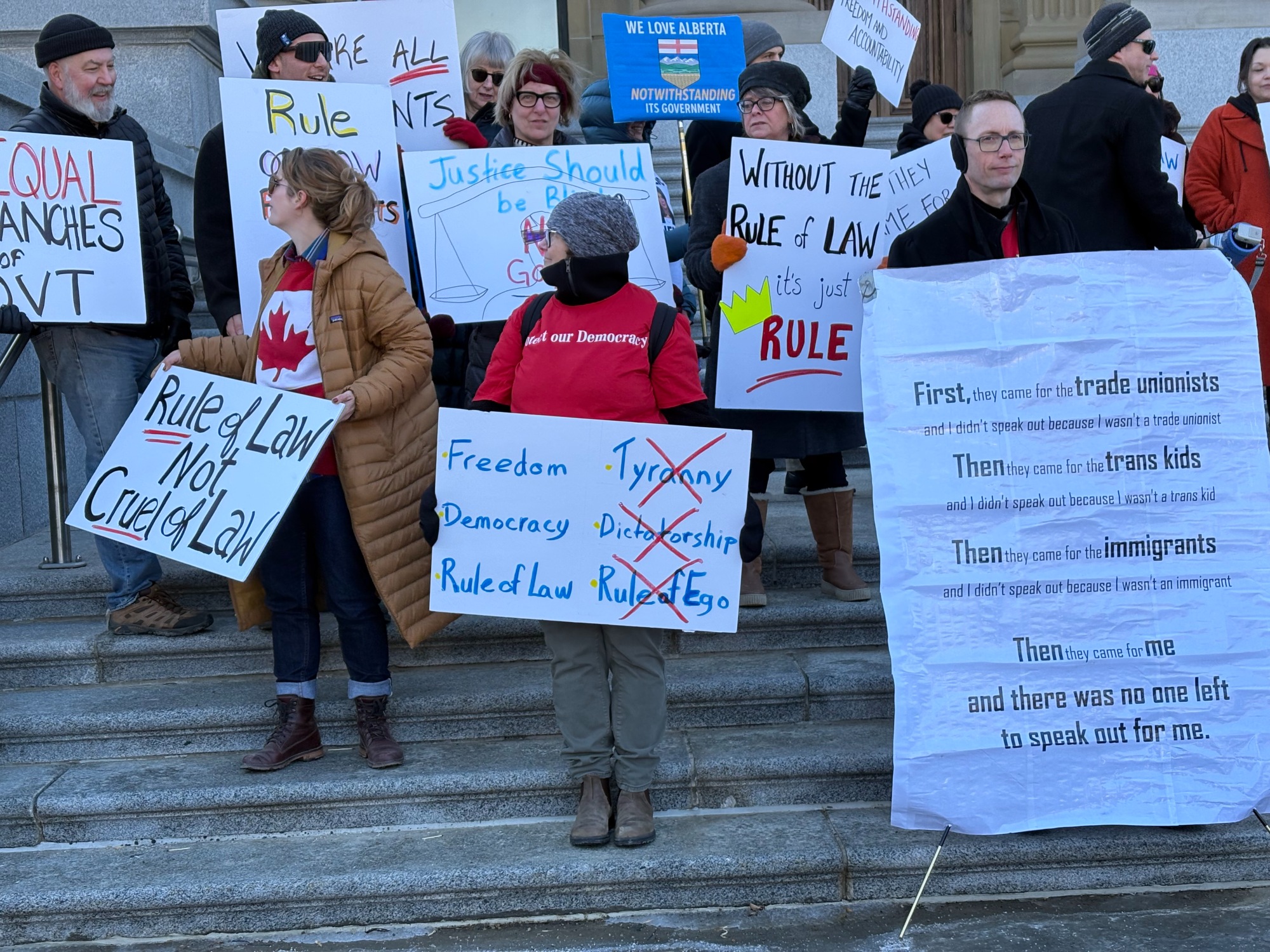 On March 10th, the Alberta Coalition of Defence Lawyers organized a protest at the Alberta Legislature against the UCP for using the Notwithstanding clause, attacking the independence of the judiciary, among other legal-related issues.