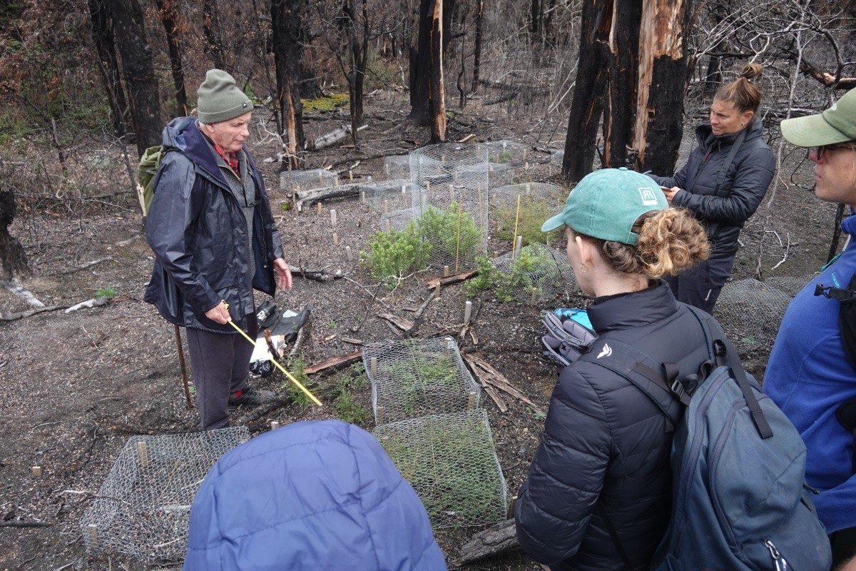 We were joined by retired restoration ecologist and pine expert Nick Ledgard, who spent much of his career working at the site. Nick now has a set of restoration trials set up to learn how to increase the native cover in the burnt area. The worry is that if left alone it will transition to a largely weed dominated vegetation.