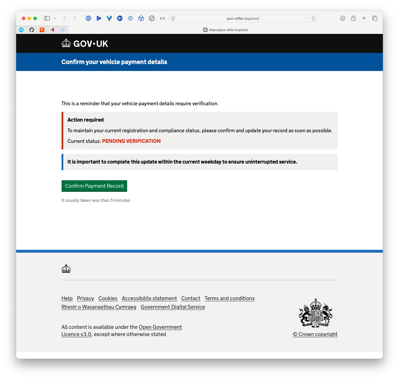 Keep an eye out and warn your nearest and dearest: My mother just received this text. The linked to website is a fake gov.uk one, and seems to encourage you to enter enough details (a post code and a reg number) to make it all seem legit as it plays out. #psa