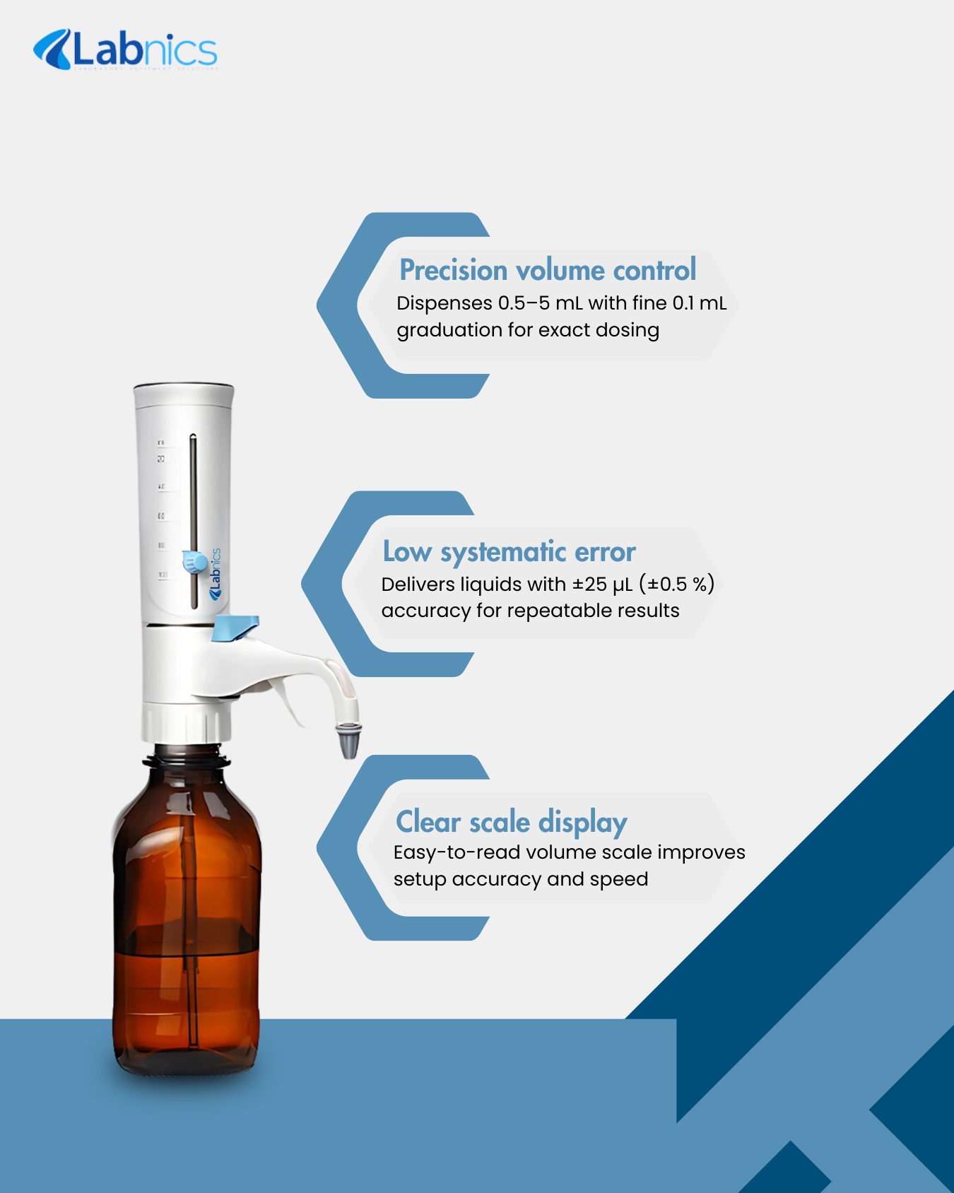 Labnics Bottle Top Dispenser offers accurate liquid dispensing with an adjustable volume range for controlled reagent transfer. It features a smooth piston system and clear volume scale for consistent operation. Suitable for laboratories handling chemicals, acids, and routine analytical applications.