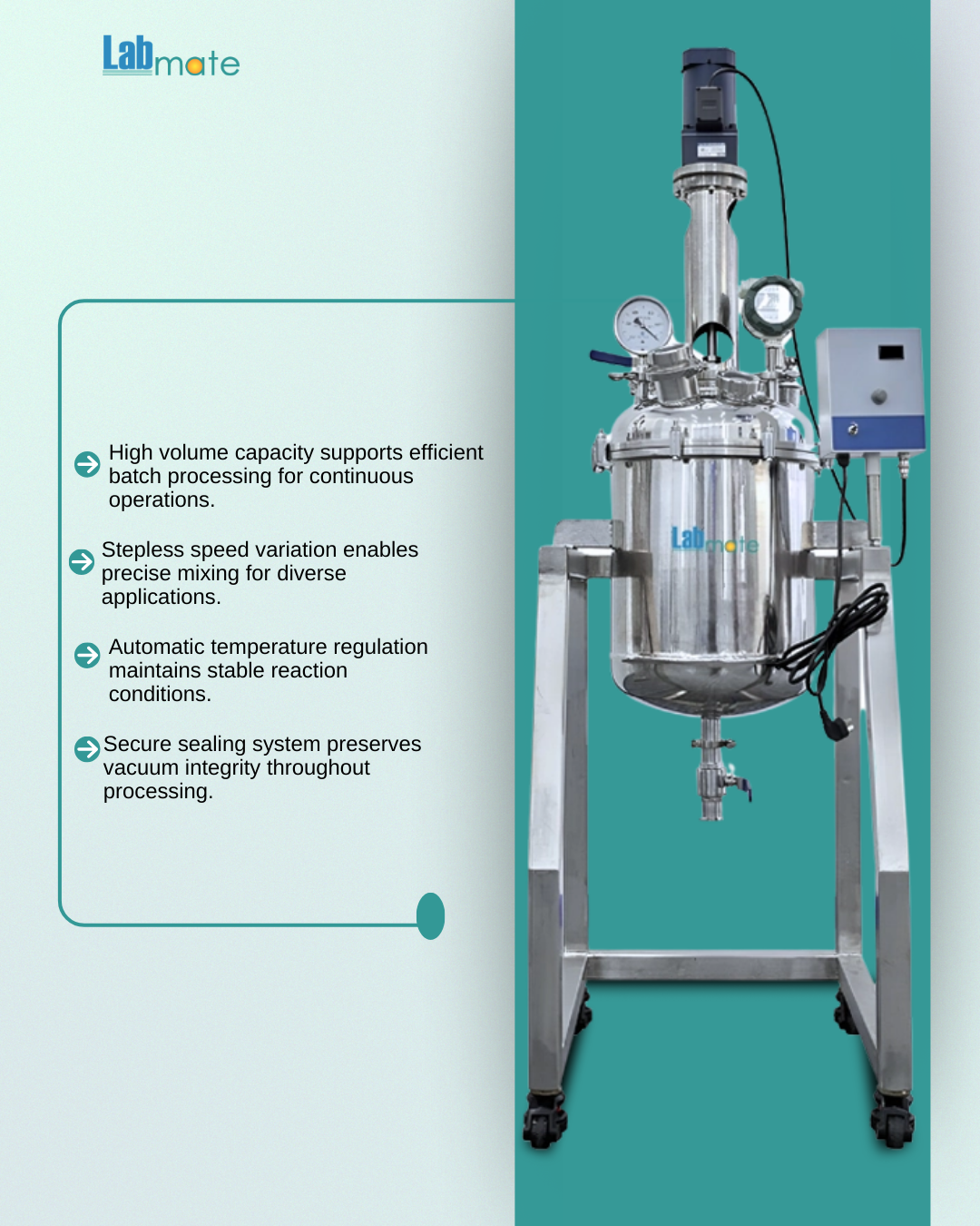 Labmate Stainless Steel Reactor offers 50 L capacity with a variable frequency motor for controlled mixing across processes. The digital display enables automatic temperature regulation and stepless speed adjustment. A mechanical seal maintains vacuum integrity for polymerization condensation and extraction.