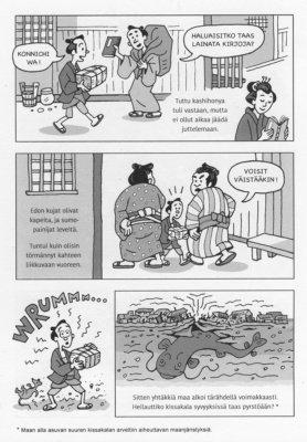 Sarjakuvasivu, jossa kolme leveää ruutua. Ensimmäisessä ruudussa oppipoika kohtaa tutun kashihonyan, joka tarjoaa kirjoja lainaan, mutta oppipoika ei ehdi jäämään juttelemaan. Toisessa ruudussa oppipoika törmää kahteen valtavaan sumopainijaan Edon kapealla kujalla. Kolmannessa maa järisee ja oppipoika kuvittelee ison kissakalan tärisyttävän kaupunkia.