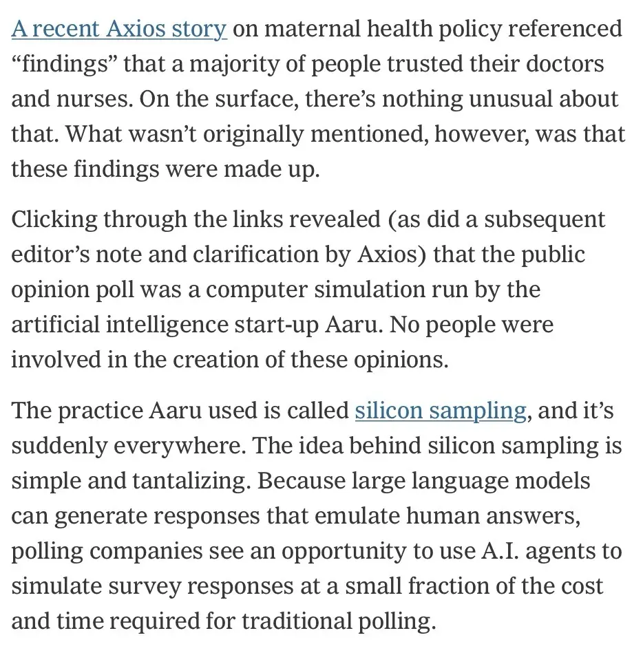 Polling already alone is incredibly hard, and internet and lack of land line phones has made even close to impossible. Anyone who has allowed such "llm generated polling" nonsenss to be published as truth should be called out to be liar.