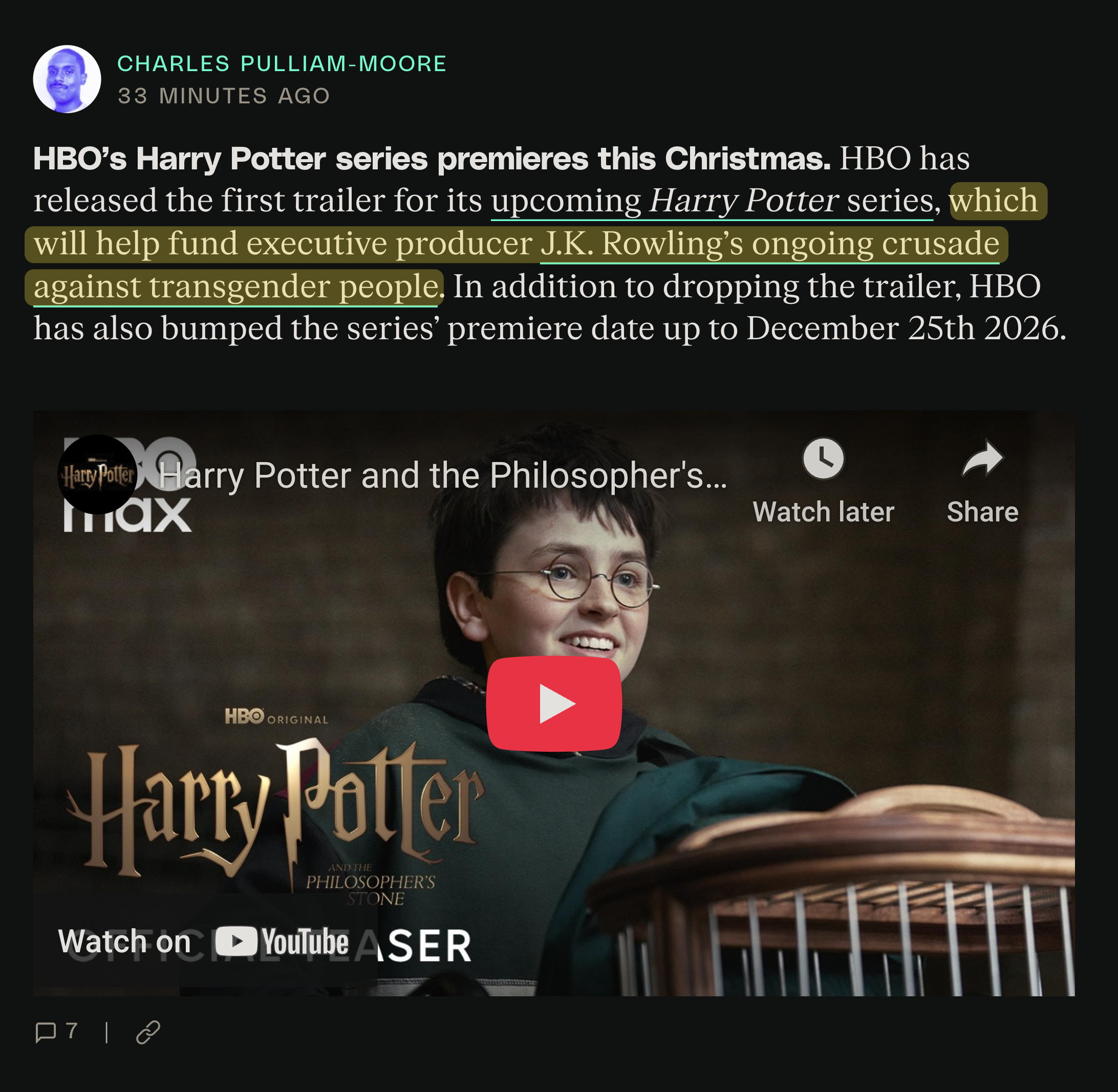 HBO has released the first trailer for its upcoming Harry Potter series, which will help fund executive producer J.K. Rowling’s ongoing crusade against transgender people. In addition to dropping the trailer, HBO has also bumped the series’ premiere date up to December 25th 2026. [Media: https://www.youtube.com/watch?v=RIu4sFKGi6E]