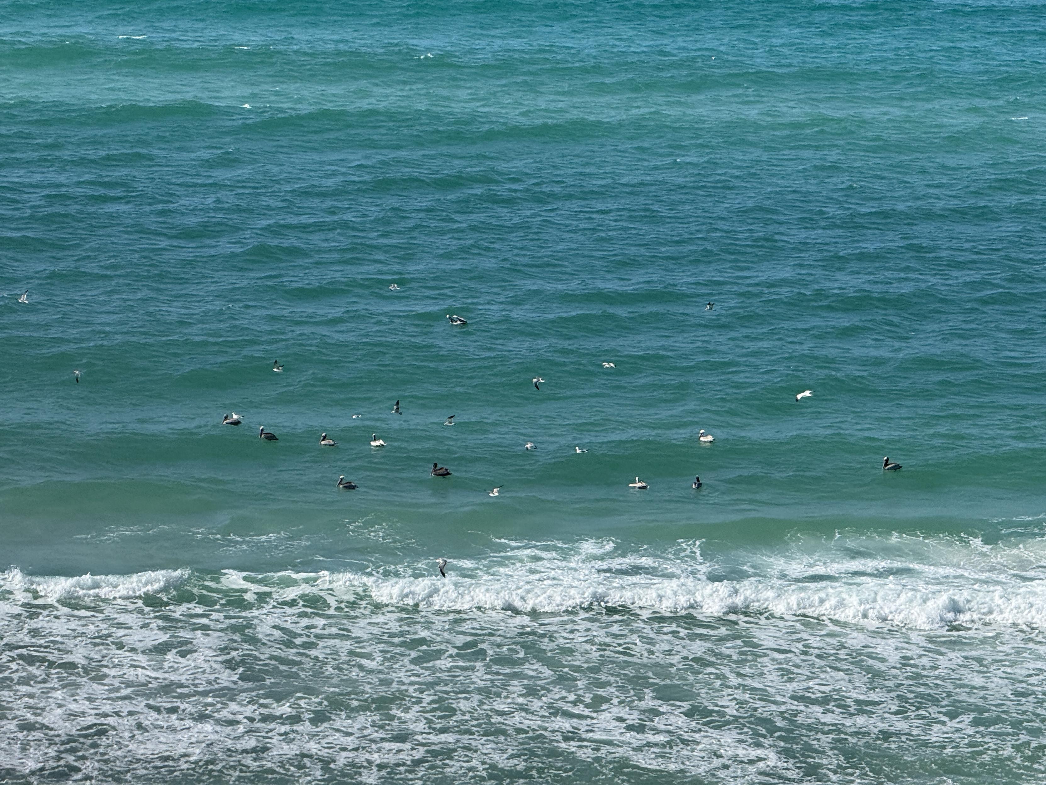 I don’t know what a flock of pelicans is called, but whatever it is just landed in the gulf in front of me