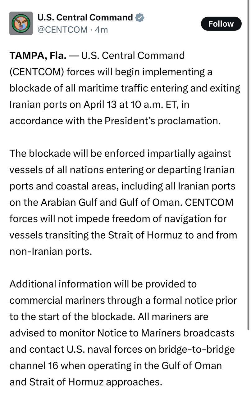 U.S. Central Command (CENTCOM) forces will begin implementing a blockade of all maritime traffic entering and exiting Iranian ports on April 13 at 10 a.m. ET, in accordance with the President’s proclamation, US military announces