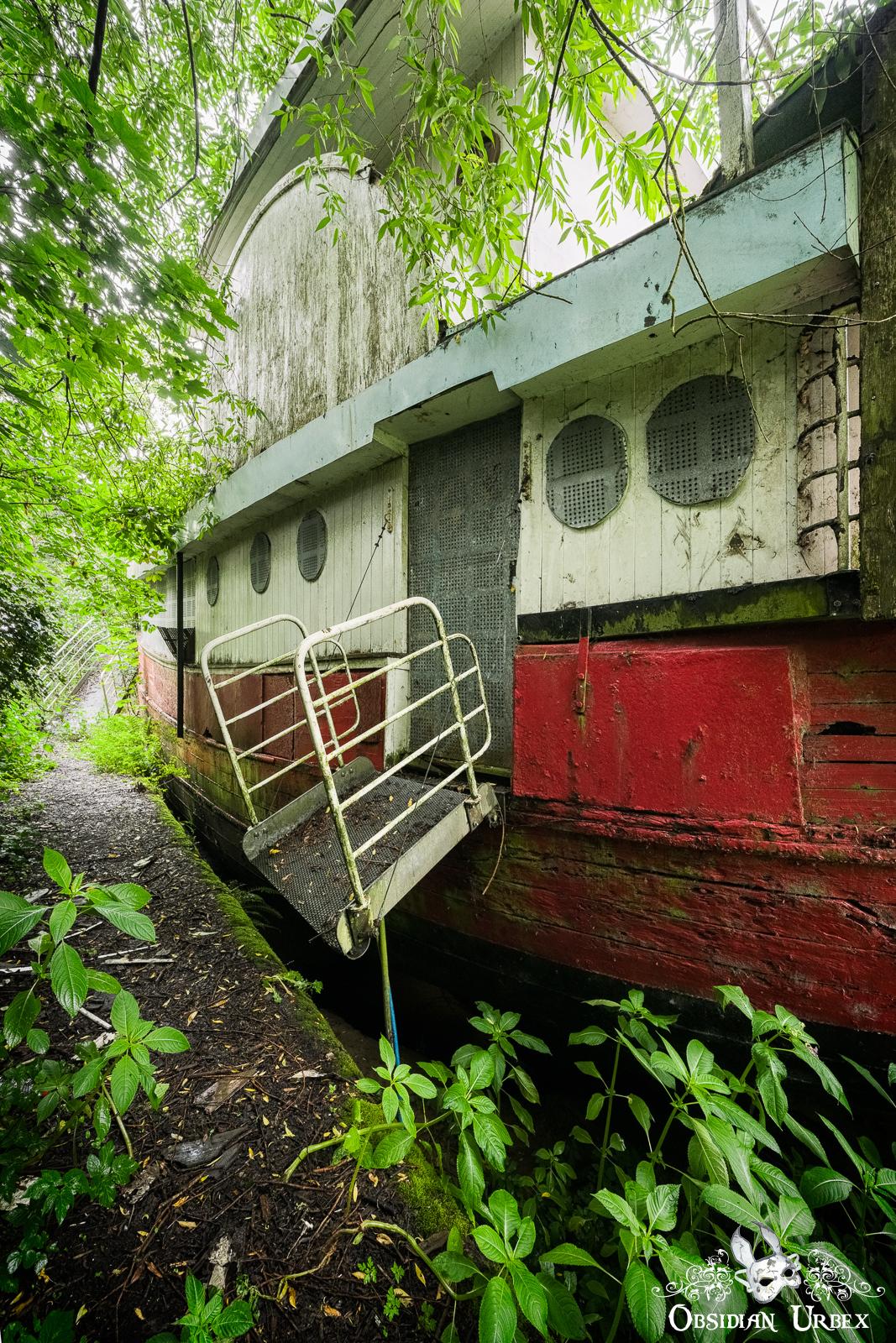 This abandoned floating restaurant is moored along a riverbank. This old Danish fishing boat was given a facelift to look like a 1920s-style paddle steamer!