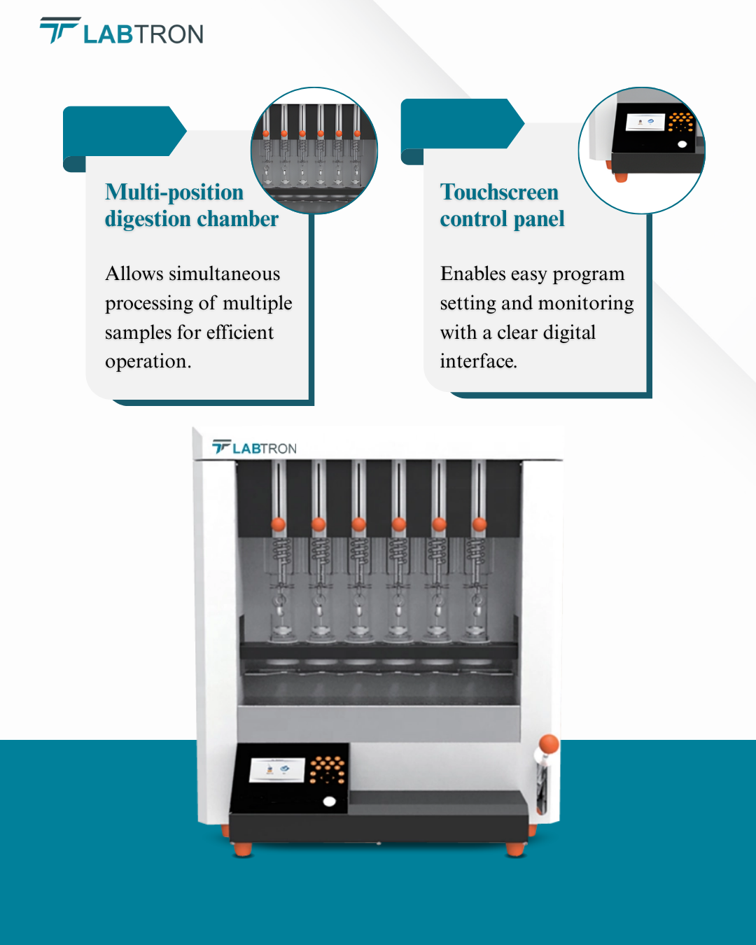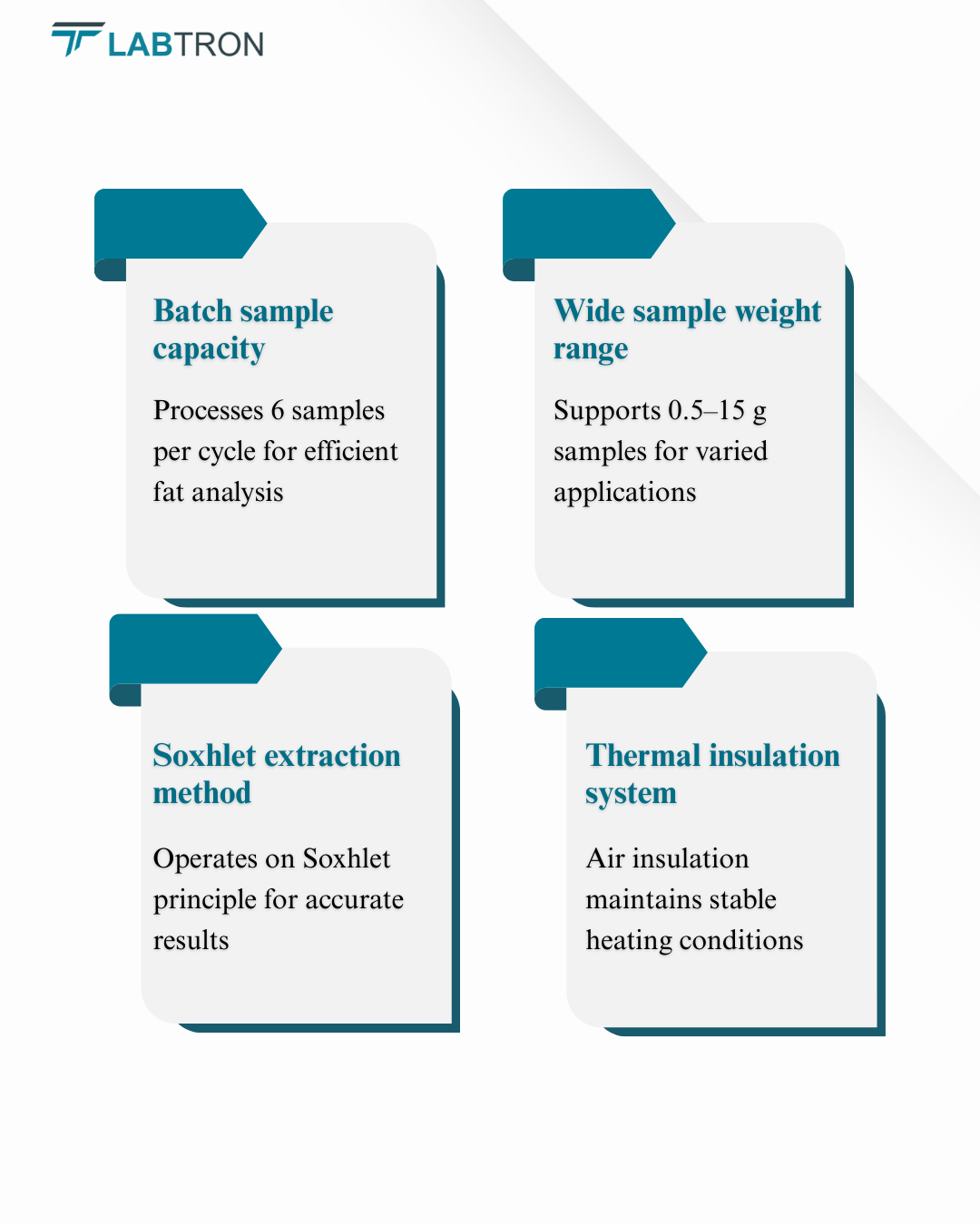 Labtron Fat Analyzer is a semi-automatic Soxhlet extraction unit for efficient fat determination. It processes up to 6 samples per batch with 0.5–15 g capacity and intelligent control for easy operation. Air insulation and linear bearing lifting support stable temperature control and smooth handling.