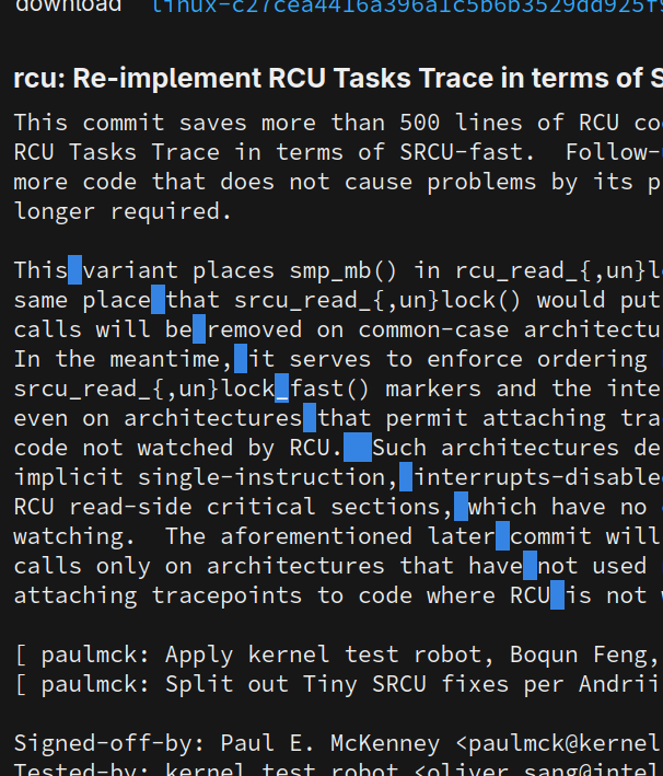 For a brief moment I assumed that @paulmckrcu was toying with us by carefully crafting this #Linux #kernel commit message to draw a diagonal line with spaces.