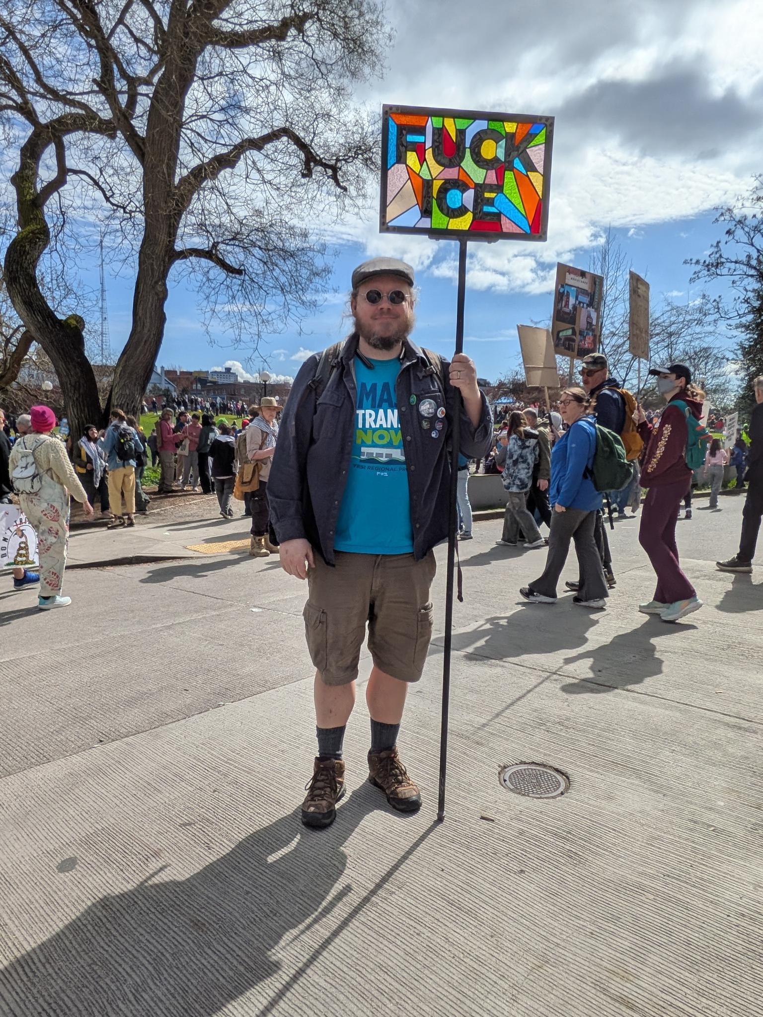Today was a nice, sunny day to break out the stained glass protest sign.