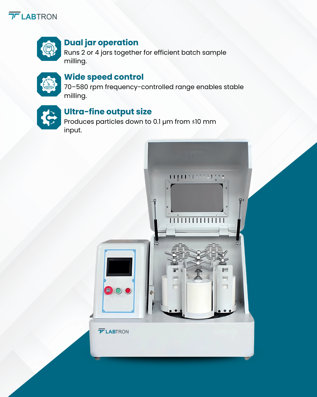 Labtron Benchtop Ball Mill runs 2 or 4 jars for dry and wet milling with 70 to 580 rpm speed. It handles ≤10 mm input size and produces granularity to 0.1 µm. Frequency control, ≤65 dB noise, timer to 9999 min, and safety features support stable operation