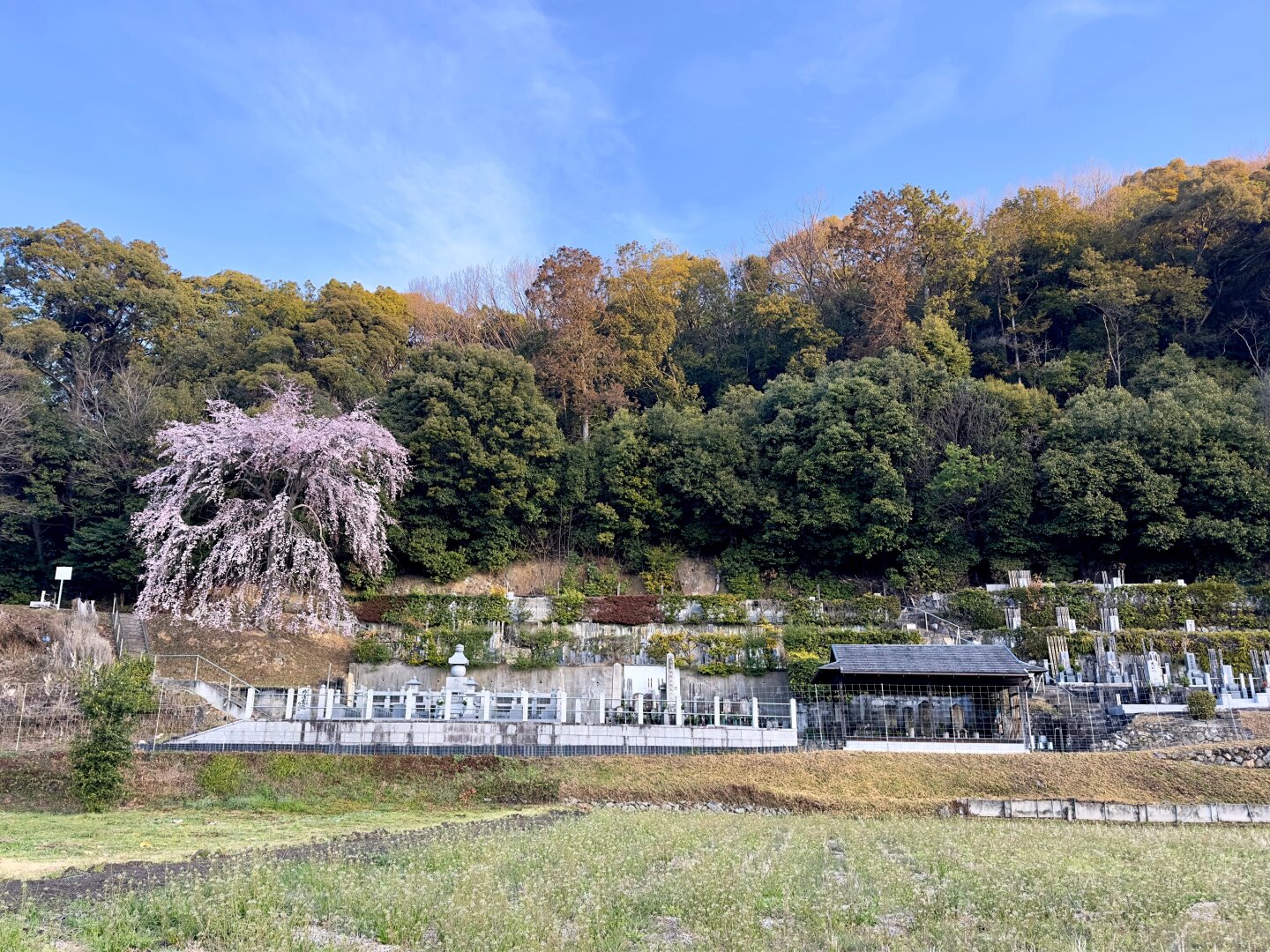 Spring has arrived in Kyoto. A weeping cherry tree is in full bloom at a cemetery