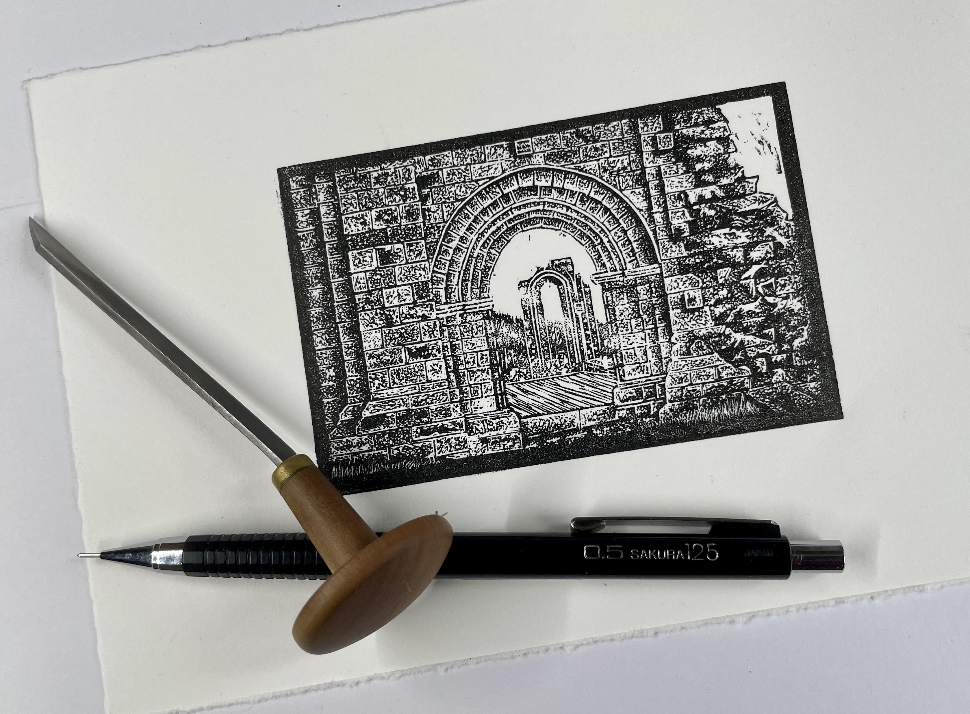 Warm light in a cold, winter sunset at Byland Abbey in N Yorkshire, England, January 2025. A year later, a wood engraving in progress, the first test print made this morning.
