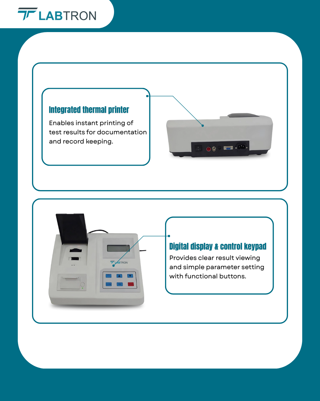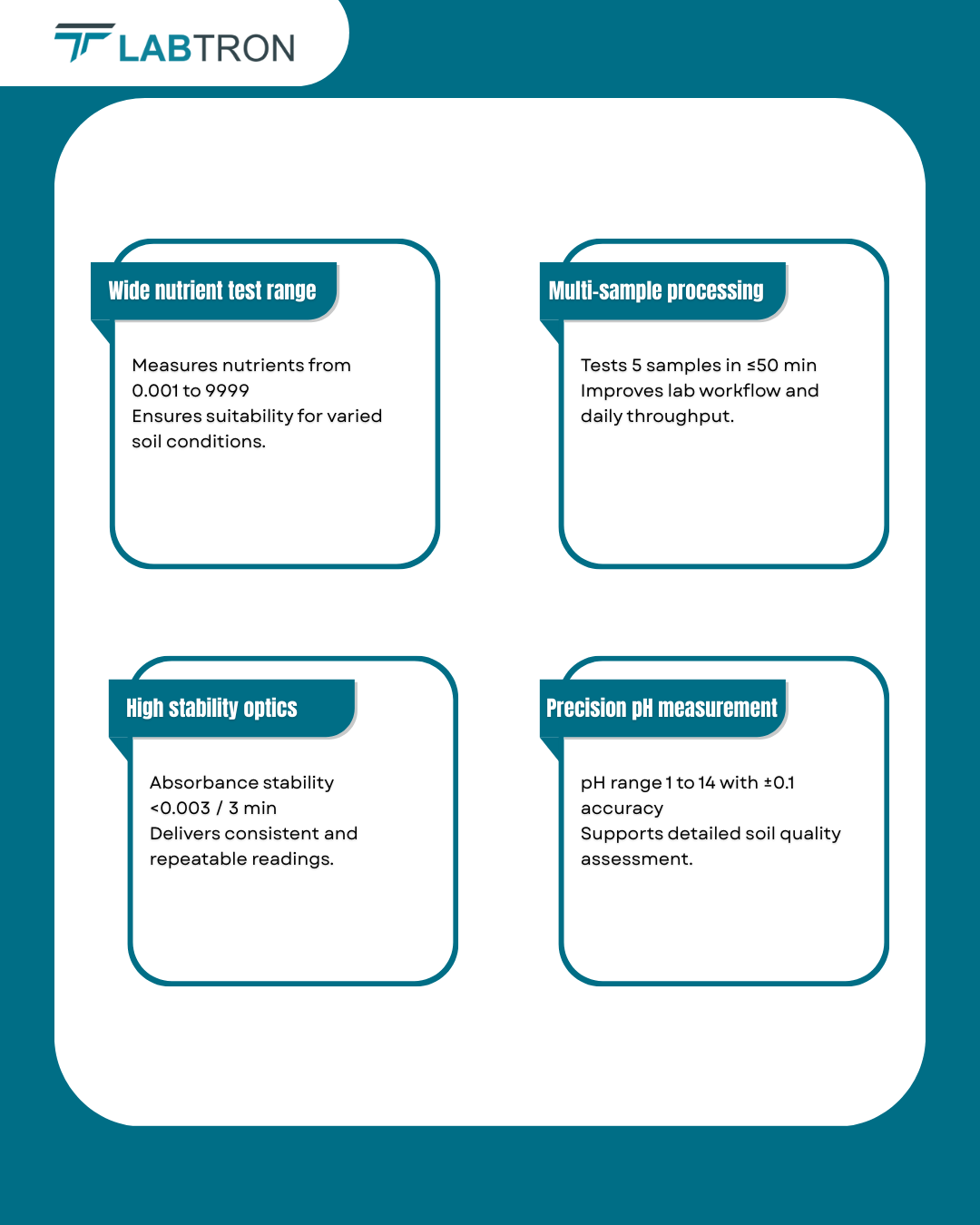 Labtron Soil Nutrient Tester uses microprocessor control to measure nutrient values in percentage for precise soil analysis. LCD touch display shows parameters and results with built-in printer for instant reports. Optical filter light source and silicon semiconductor receiver support long service life.