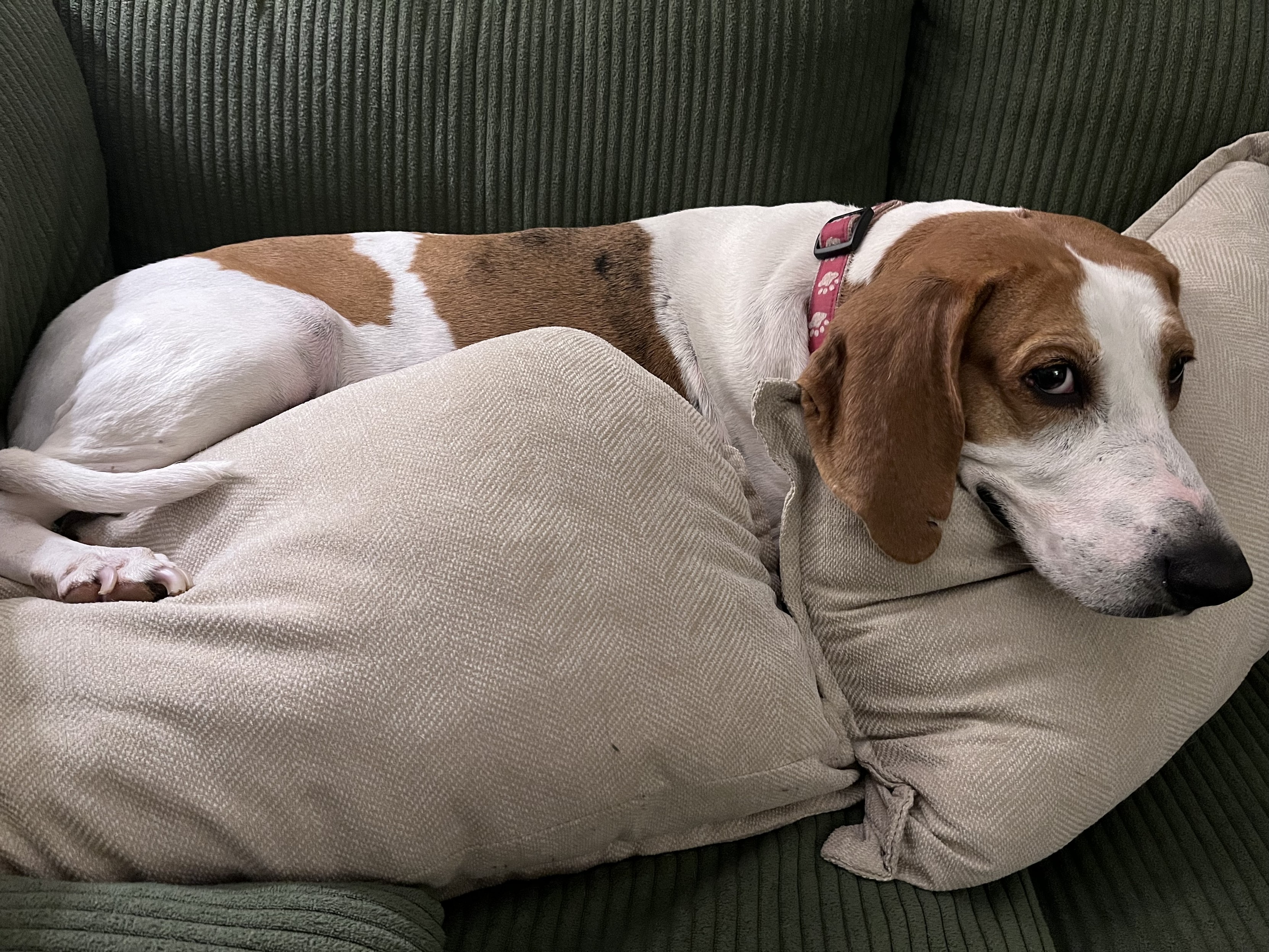 Dear fediverse, I have some recent pictures of Pancake the Dog I thought you might enjoy.