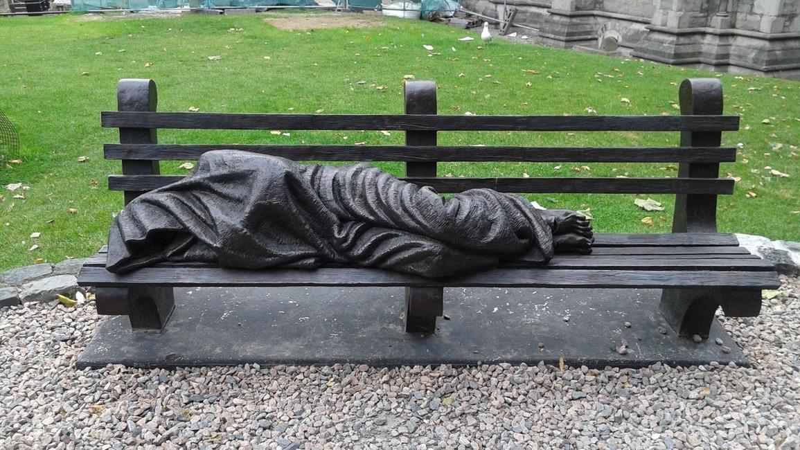This post makes the think of the statue of Jesus the Homeless I first saw outside a church in Dublin, Ireland. There's a similar one in Austin, Texas. This sculpture today would be Jesus trying to get comfortable on a bench designed to be as hostile as possible.