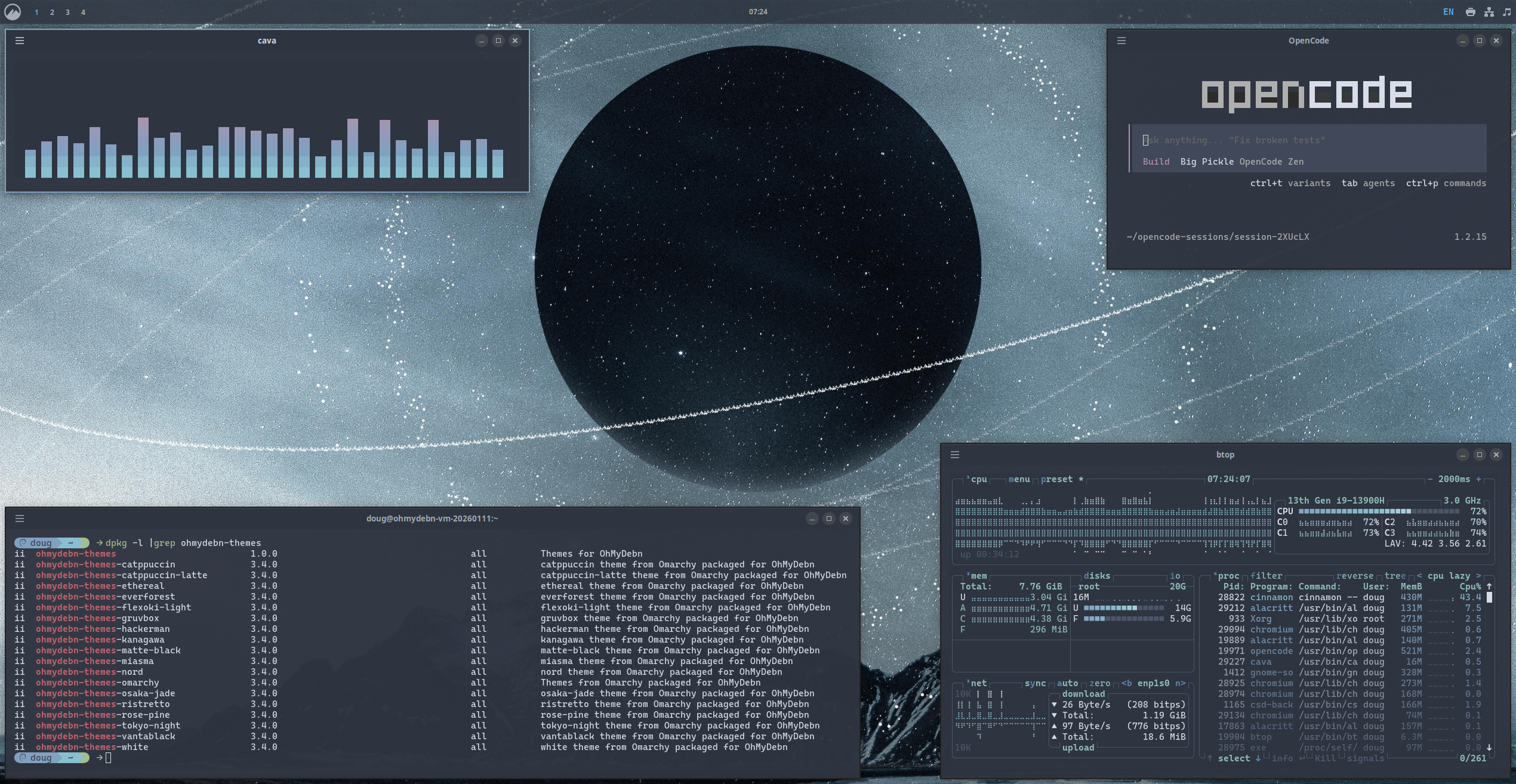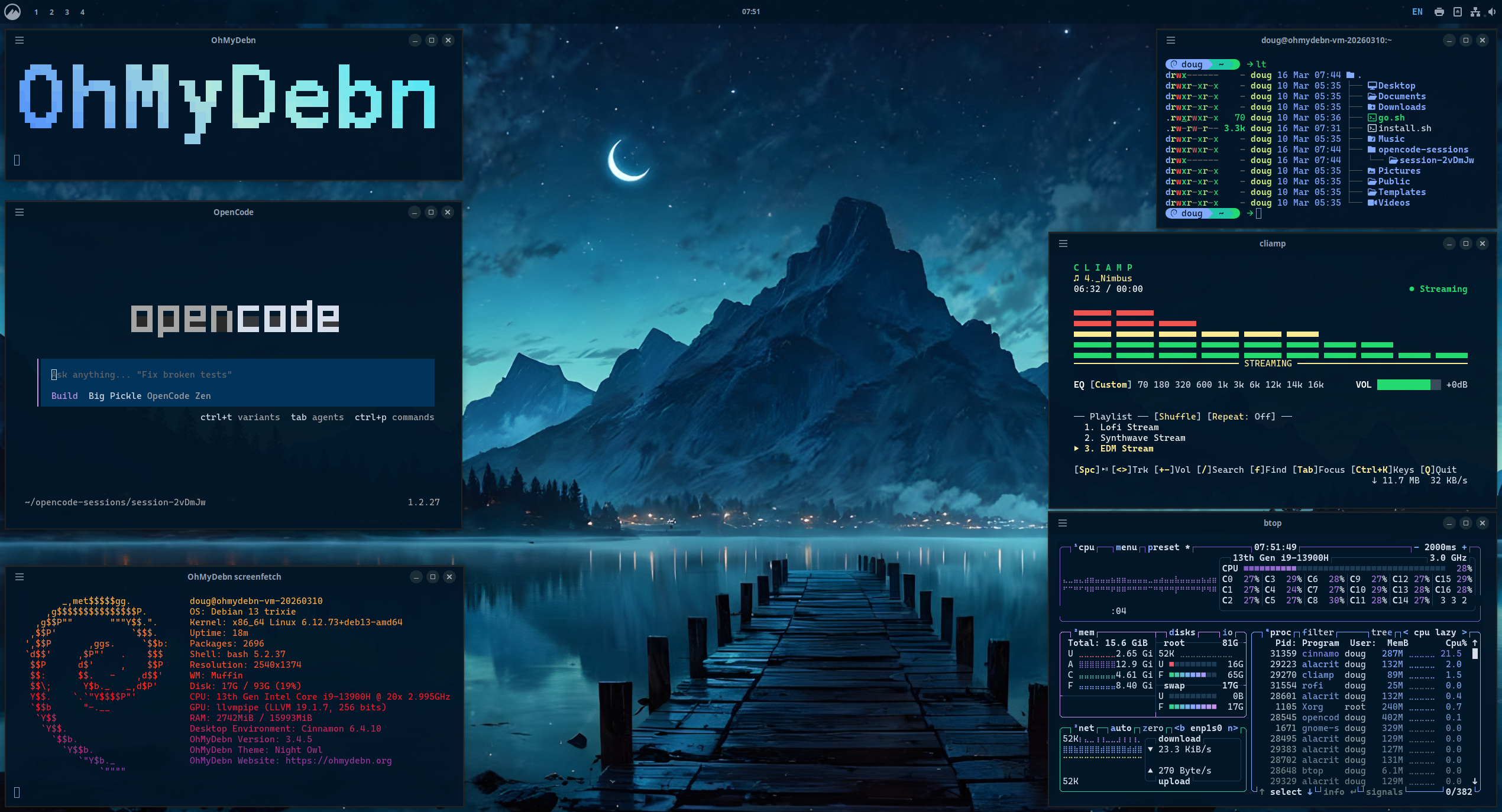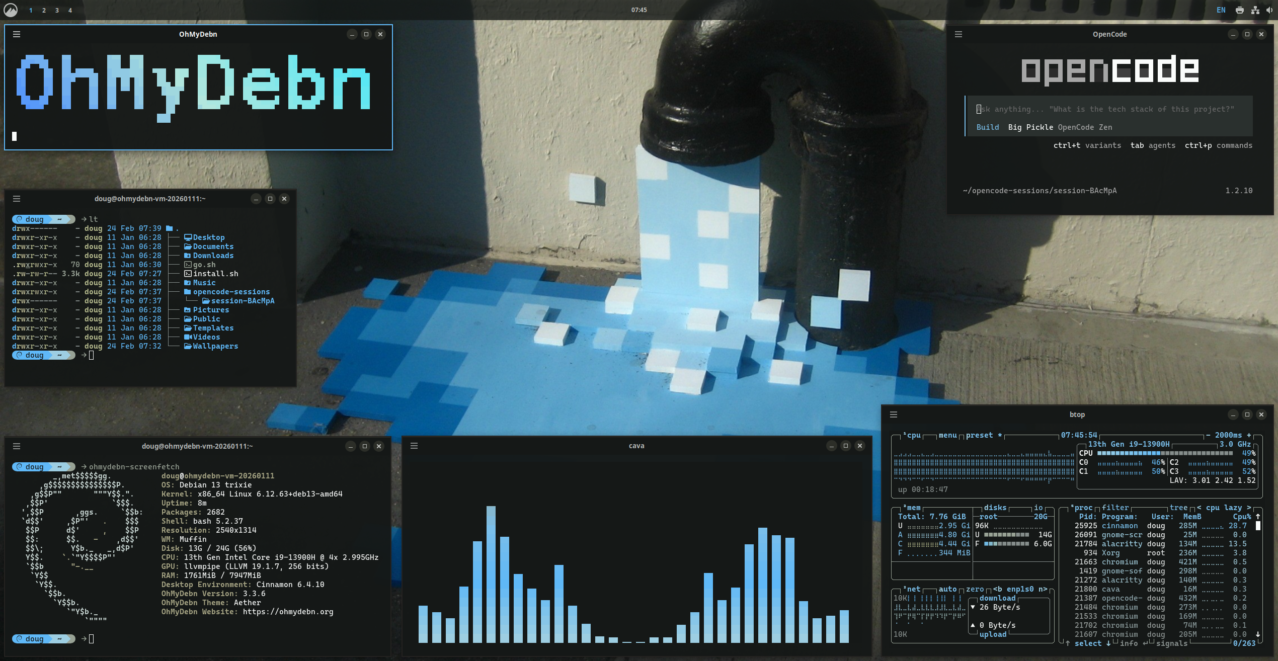 OhMyDebn 3.3.6 now available!OhMyDebn is a debonair Linux platform that gives you the stability of the Debian distro, the ease of use of the Cinnamon desktop, the beauty of Omarchy, and the power of AI.In this release:- Massive improvements to our theme support- Update OpenCode to 1.2.10- Install traceroute by defaulthttps://ohmydebn.org