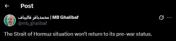 ✔️ The situation in the Strait of Hormuz will not return to its pre-war state, says Iranian Parliament Speaker Mohammad-Bagher Ghalibaf Original Post Follow TRN 👈