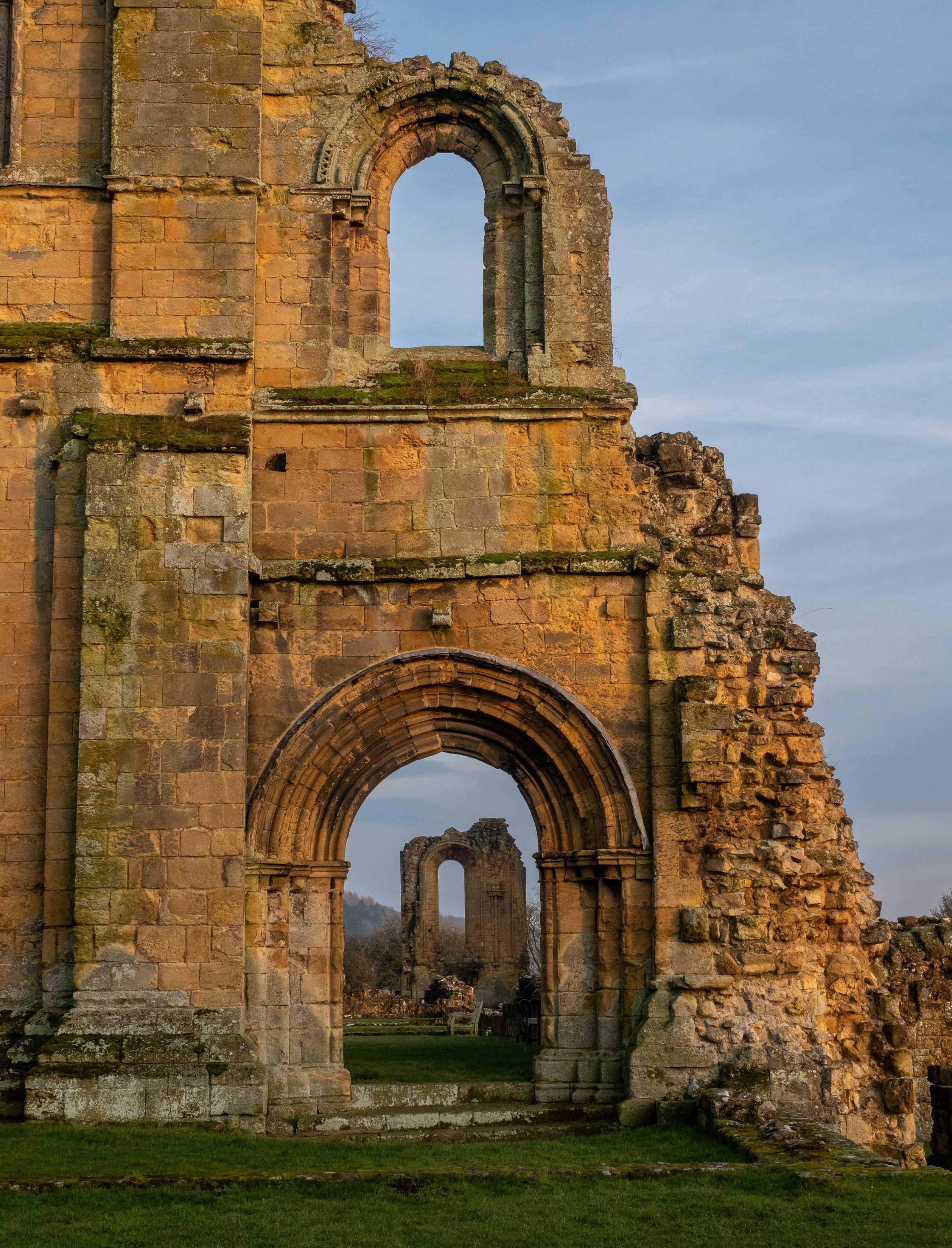 Warm light in a cold, winter sunset at Byland Abbey in N Yorkshire, England, January 2025. A year later, a wood engraving in progress, the first test print made this morning.Byland Abbey is one of several mediaeval monastic ruins in the area built in beautiful local sandstone/limestone which changes with the light from austere grey to gold.