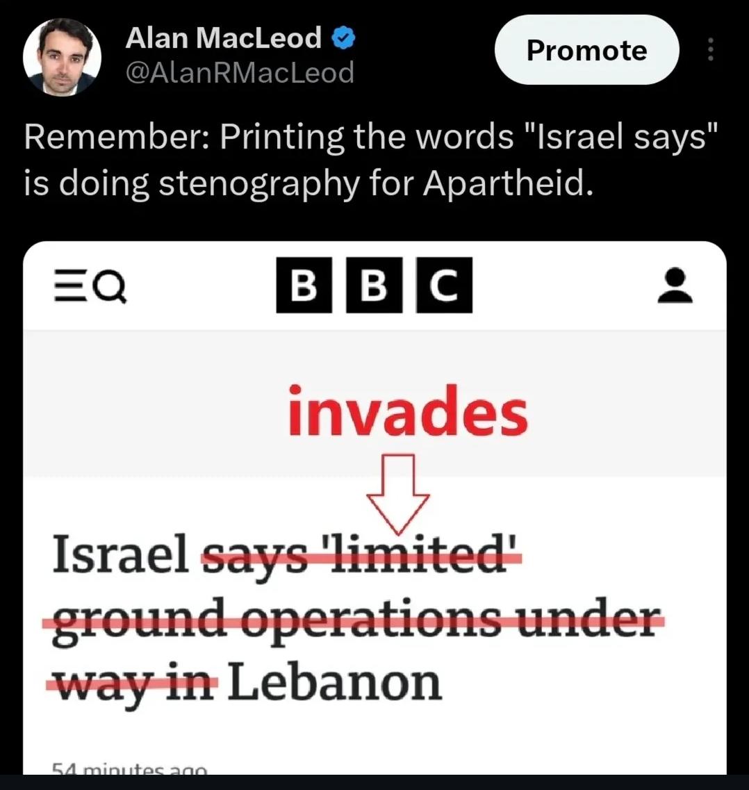 @Maria1958 Uma publicação no Twitter de Alan MacLeod ([@]AlanRMacLeod), com uma marca de verificação, exibe sua foto de perfil, nome, nome de usuário e um botão "Promover". O texto do tweet diz: "Lembrem-se: escrever as palavras 'Israel diz' é fazer trabalho de escriba para o Apartheid." Dentro do tweet, há uma captura de tela de uma página da BBC, mostrando o logotipo da "BBC" no topo, seguida pela palavra "invade" em texto vermelho com uma seta apontando para a frase "Israel diz 'operações terrestres limitadas' em andamento no Líbano". Nesta frase, as palavras "Israel diz" e a palavra "limitadas" estão riscadas com linhas horizontais vermelhas. O carimbo de data e hora "há 54 minutos" aparece abaixo da captura de tela.Fornecido por @altbot, gerado localmente e de forma privada usando Qwen3-Vl:8b Energia utilizada: 0.436 Wh