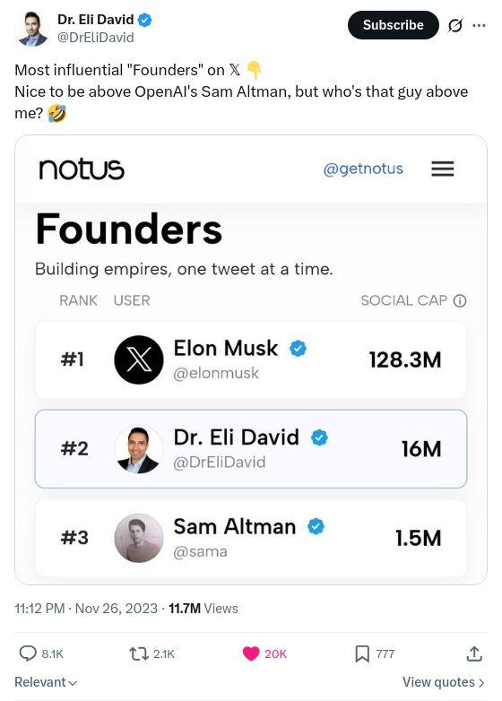 Most influential "Founders" on 𝕏 Nice to be above OpenAI's Sam Altman, but who's that guy above me?