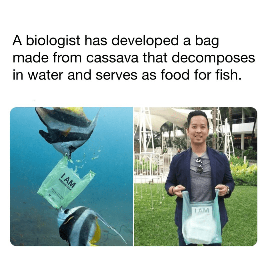 Researchers and entrepreneurs in Indonesia have developed biodegradable packaging made from cassava that dissolves in water. One of the examples was created by biologist Kevin Kumala, whose cassava-plastic bags can safely be eaten by fish.
