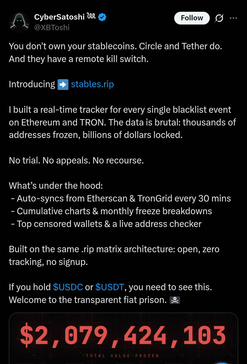 A new narrative is being established, not just here but on TC's podcast and elsewhere: that "stablecoins are bad because they are CBDCs."This is a half-truth. The full truth is that this only applies to some stablecoins.Ask yourself: why aren't they mentioning the others?