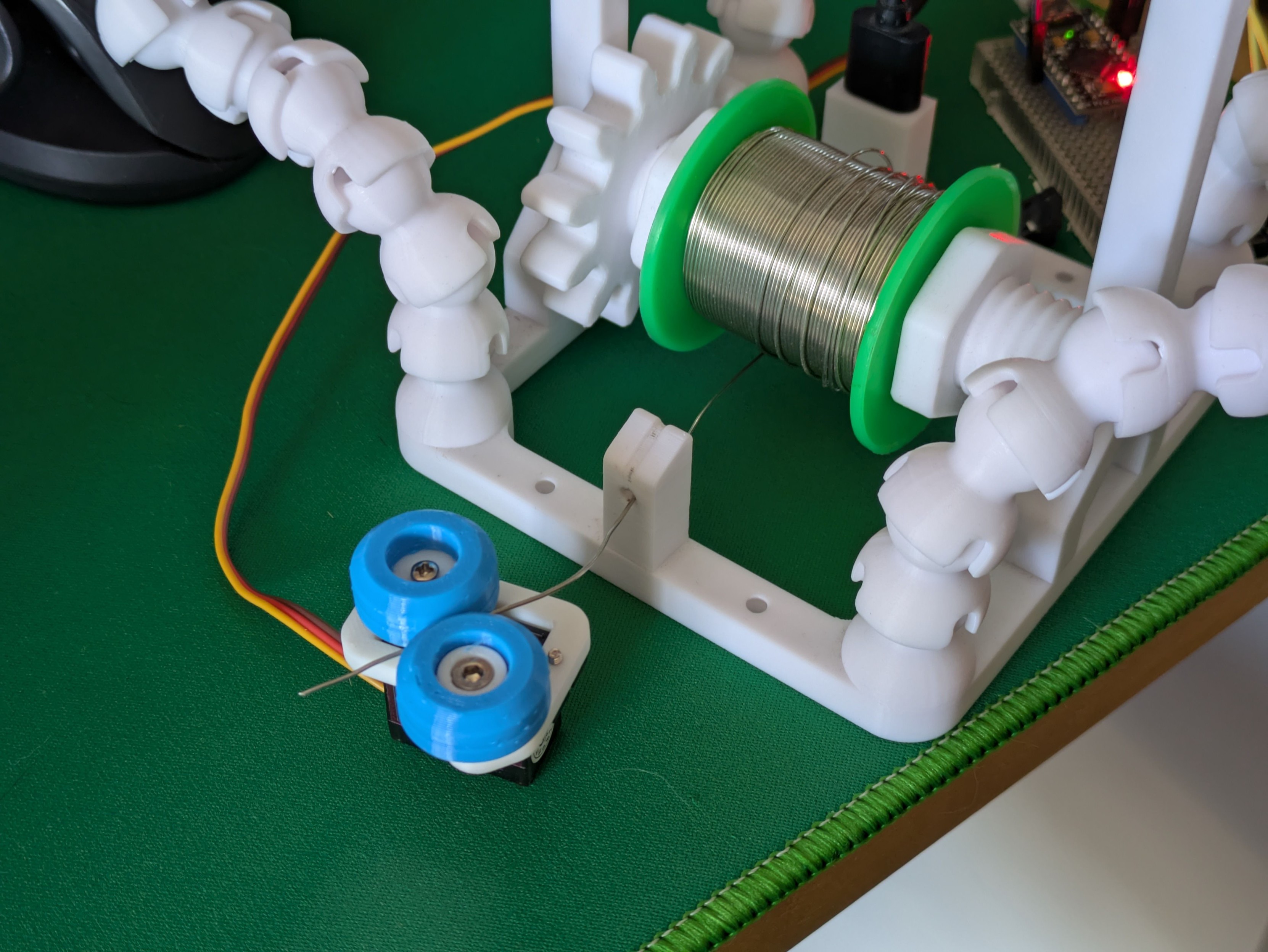 Proof of concept: A servo motor, a little platform with an opposing wheel, and two TPU tyres with a tiny groove down the middle will very capably grab a length of solder and push/pull it.