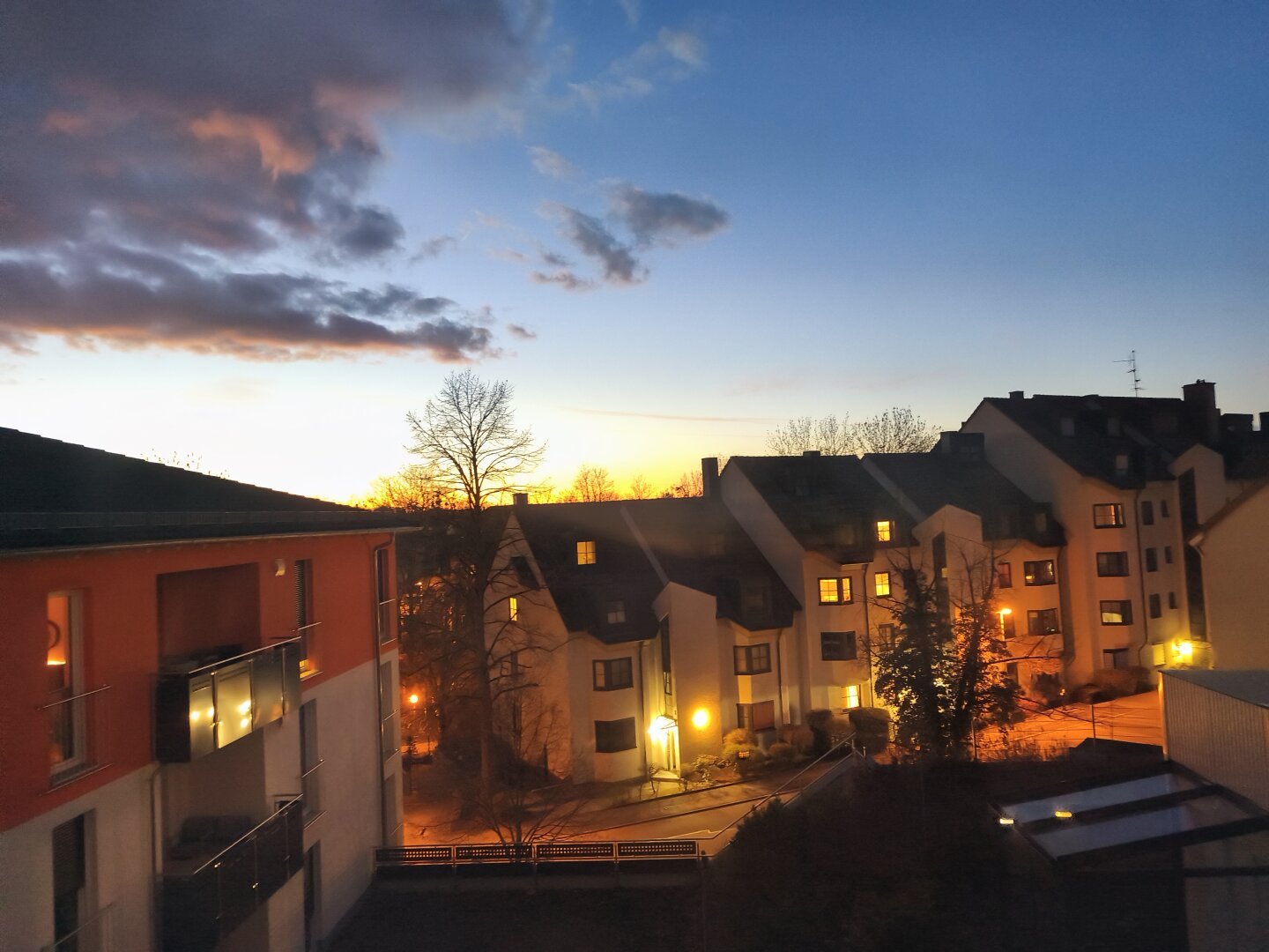 #Abendstimmung #keinfilter #fensterfreitag - Man sieht die letzten Reste eines Sonnenuntergangs, davor eine Wohnstraße mit warmer Beleuchtung.