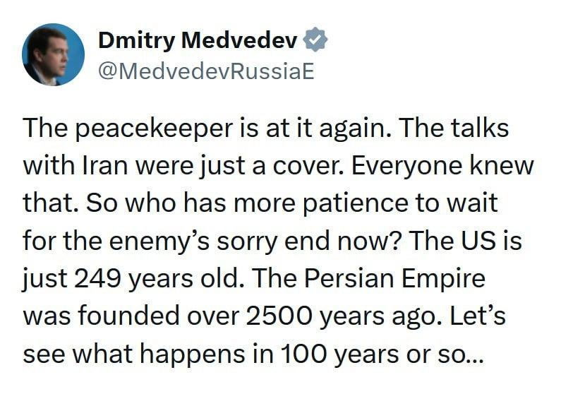 Dmitry Medvedev on U.S.–Iran talks Russia’s Security Council Deputy Chairman Dmitry Medvedev says the “peacekeeper” narrative is misleading — talks with #Iran were just a cover, and everyone knew it was preparation for military action, not diplom