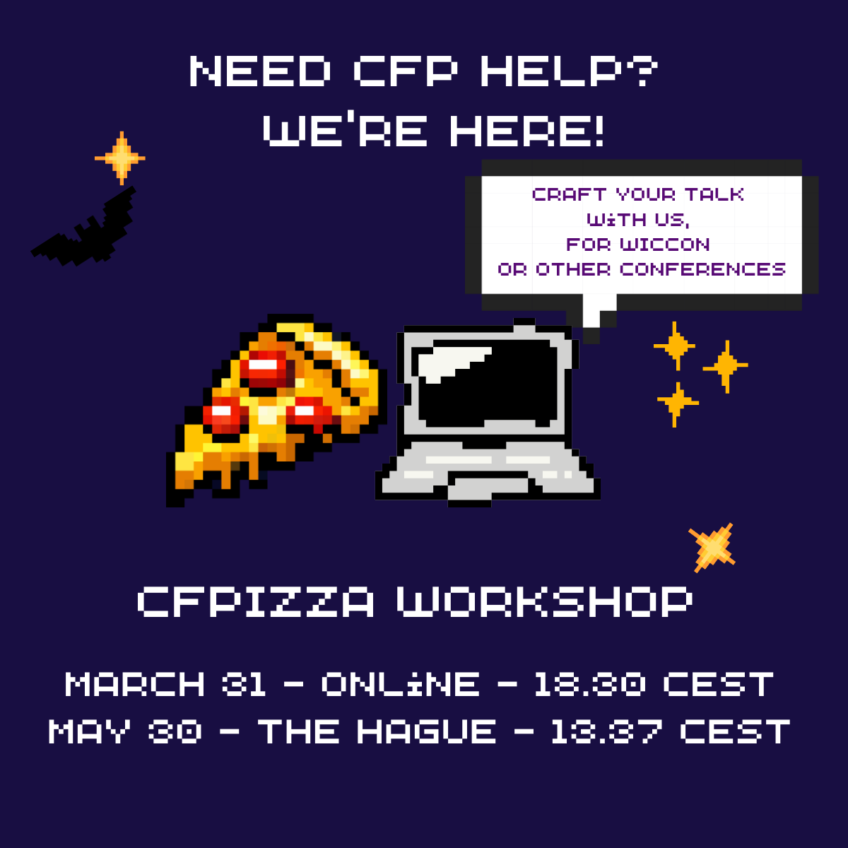 Need support with creating the killer talk? Get help to be a speaker in Cyber Security!We are organising two CFPizza meetups to help you craft your submission to Wiccon and/or other conferences! -> March 31 Online 18:30 CEST-> May 30 The Hague 13:37 CESTmore info: https://www.meetup.com/wiccanl/events/